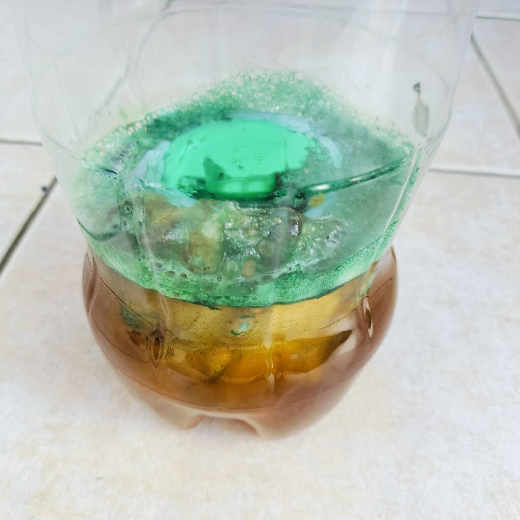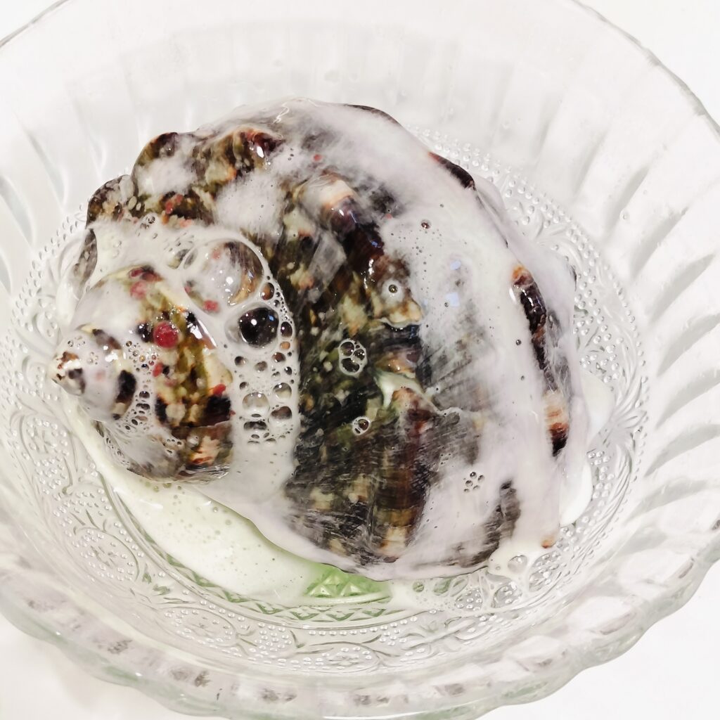 サンポール中の塩酸と夜光貝殻の炭酸カルシウムが反応することで、塩化カルシウム、水、二酸化炭素が生成されます。