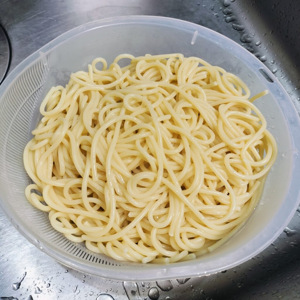 茹で終わったら、麺がくっつかないようにオリーブオイルをかけて よく混ぜます。
