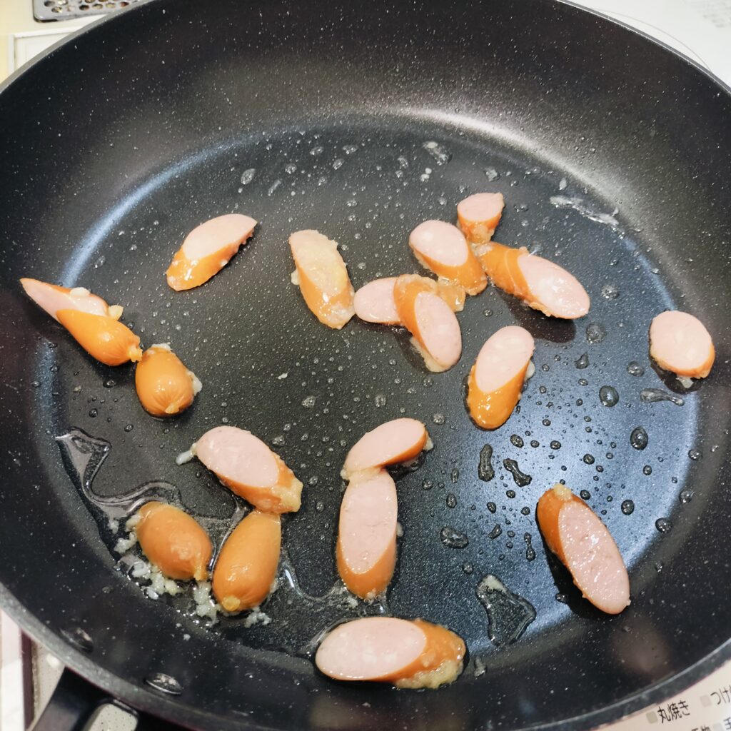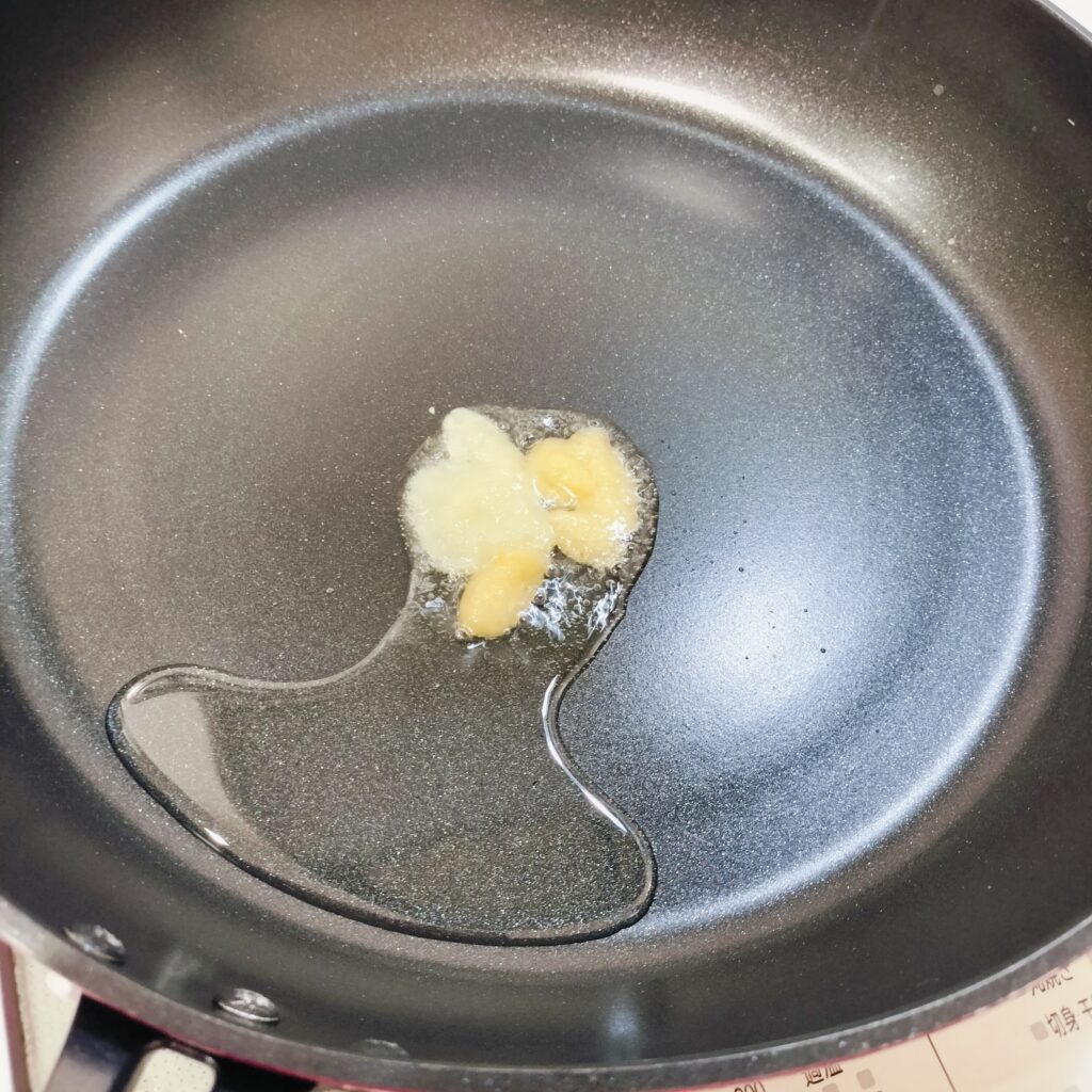 中火のフライパンにオリーブオイルを入れ、にんにくと生姜を入れます。面倒なんでチューブです。