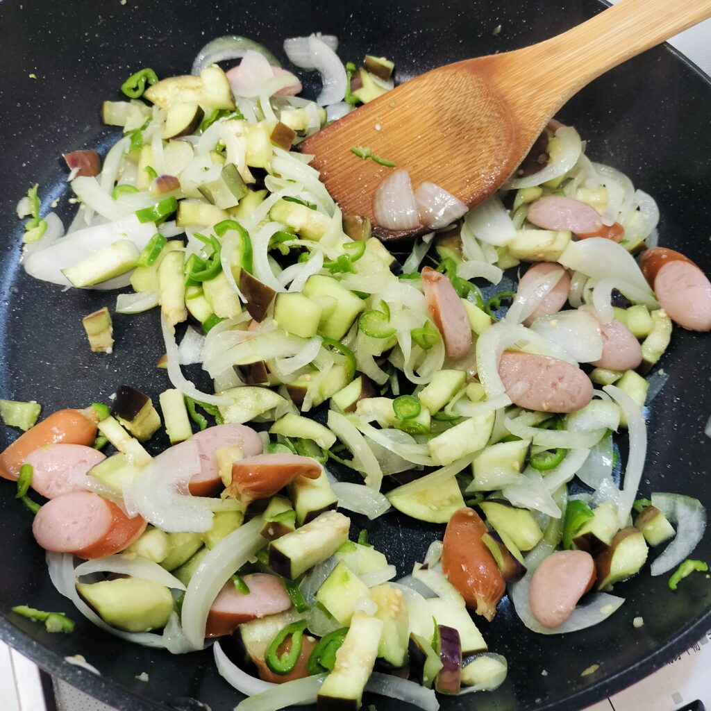 玉ねぎ、ナス、ピーマンを入れ、よく炒めます。
