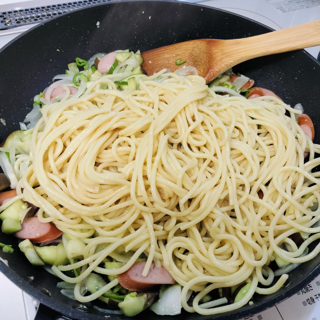 玉ねぎがしんなりしてきたら、茹でた麺を入れます。