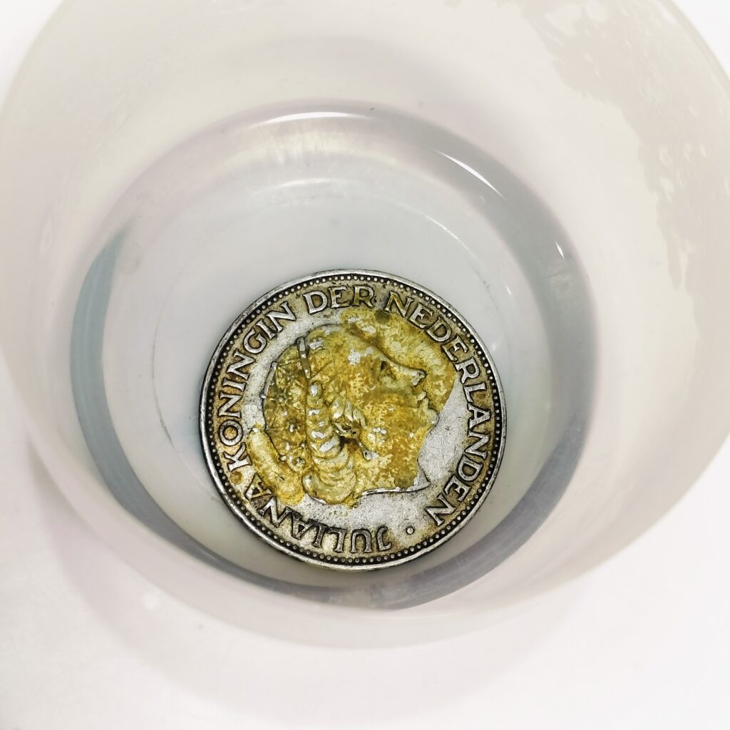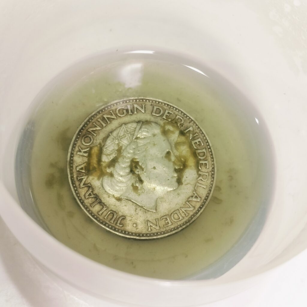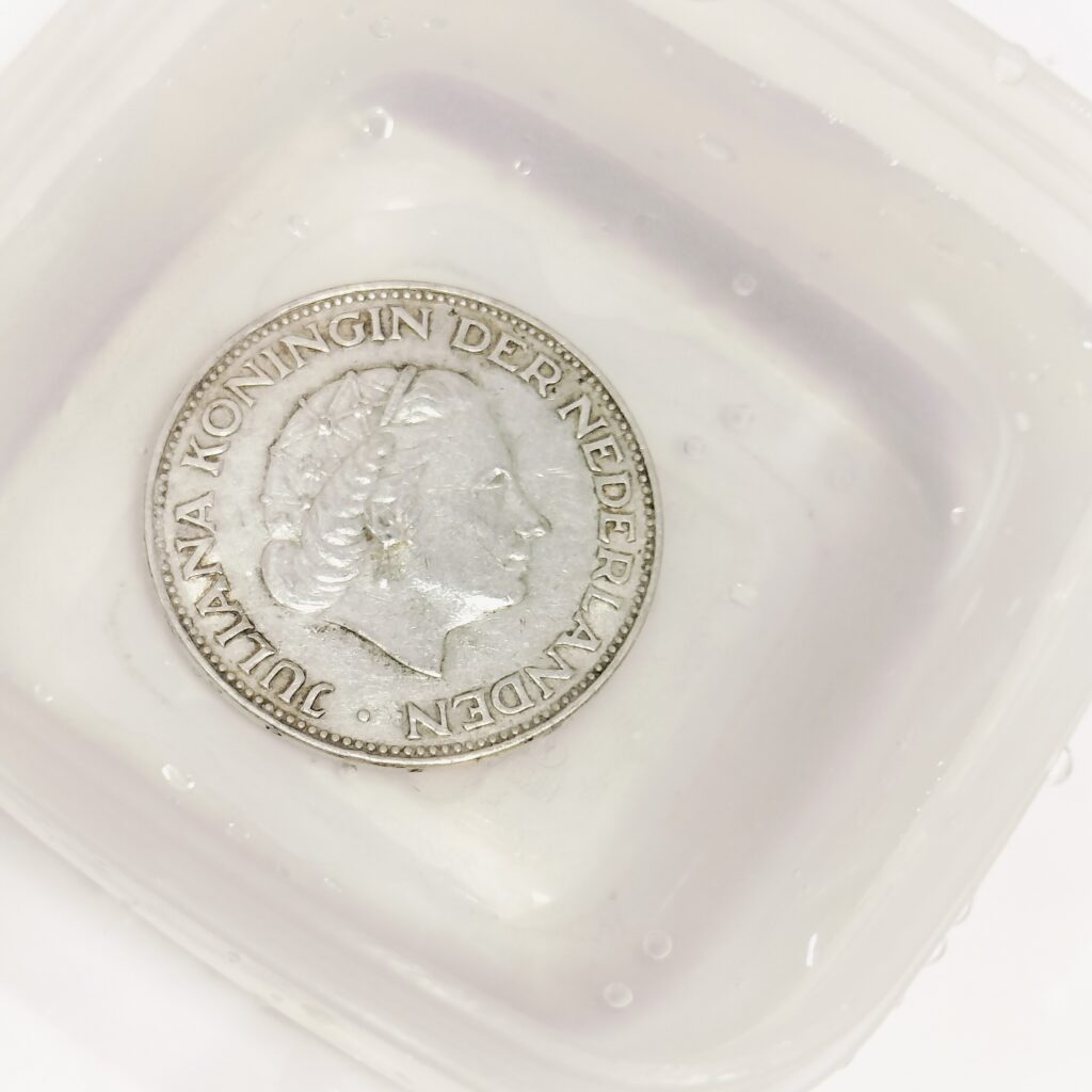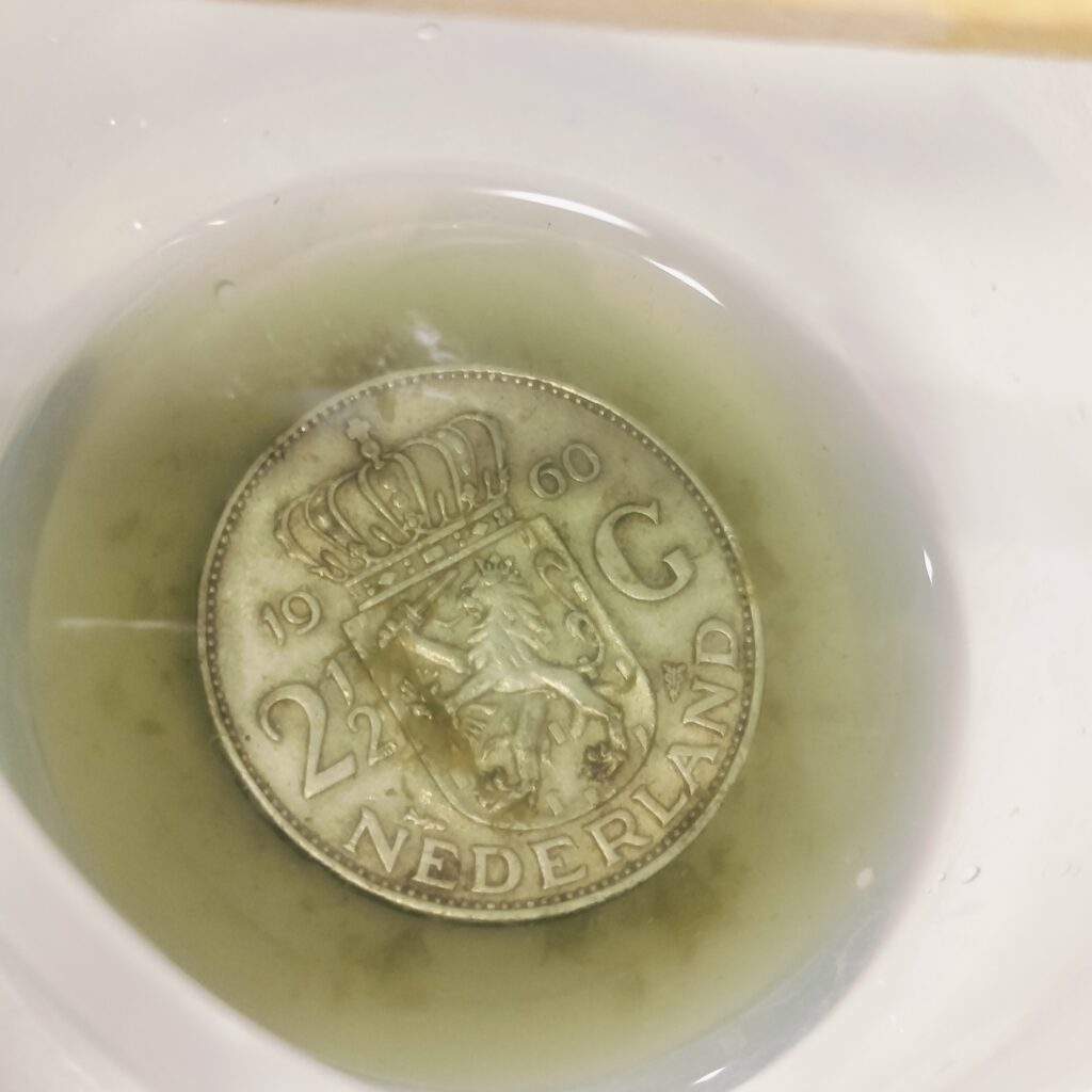 経験上、コインに付着したテープ糊はアンモニア水で除去できるので試してみます。