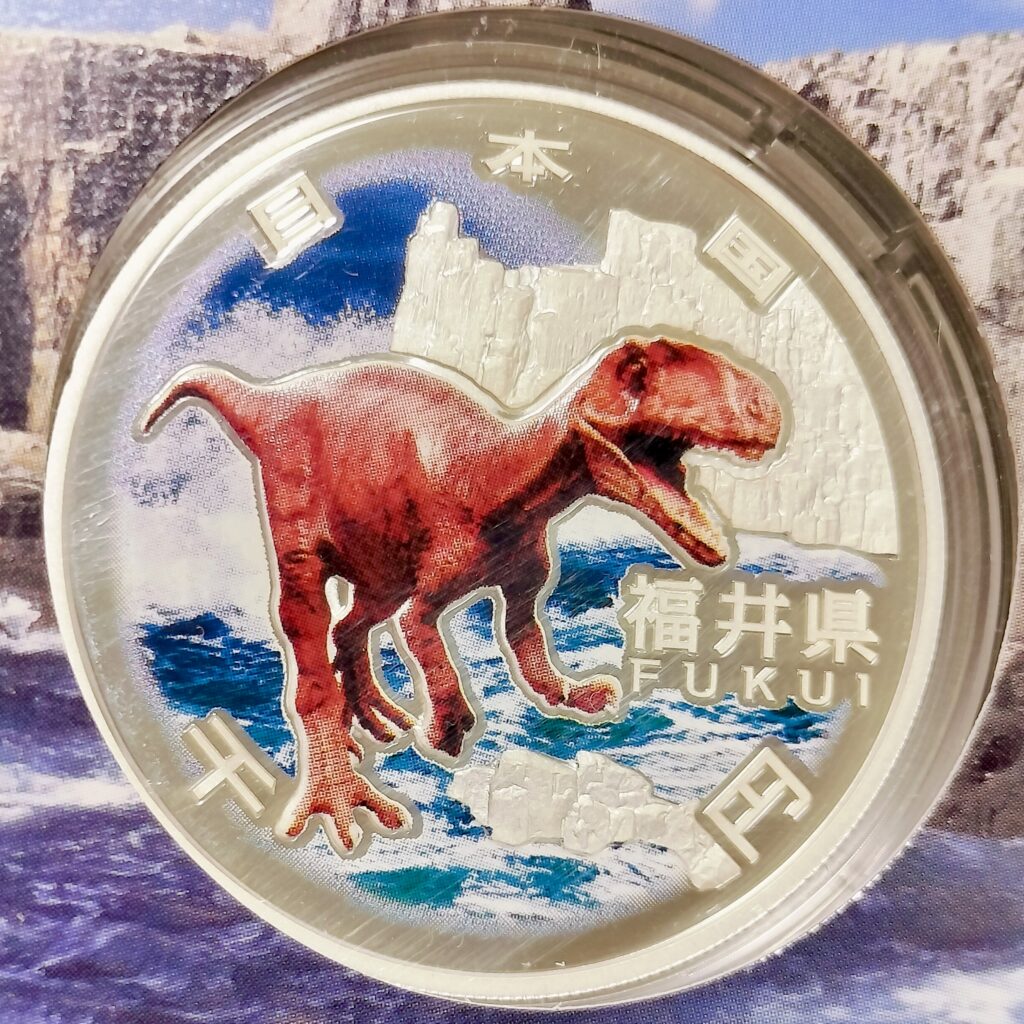 恐竜のデザインが特徴的な 福井県の千円銀貨です。
