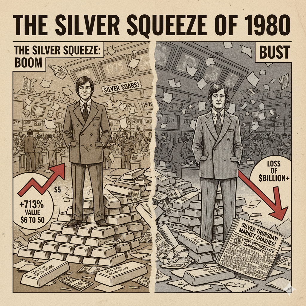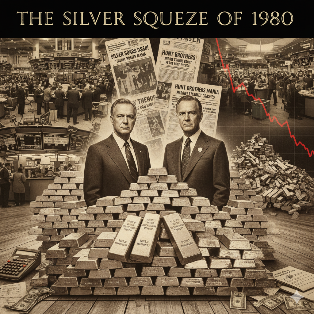 - ハント兄弟は1979年から1980年にかけて大量の銀(市場の約3分の1)を買い占め、価格を大幅に吊り上げた。