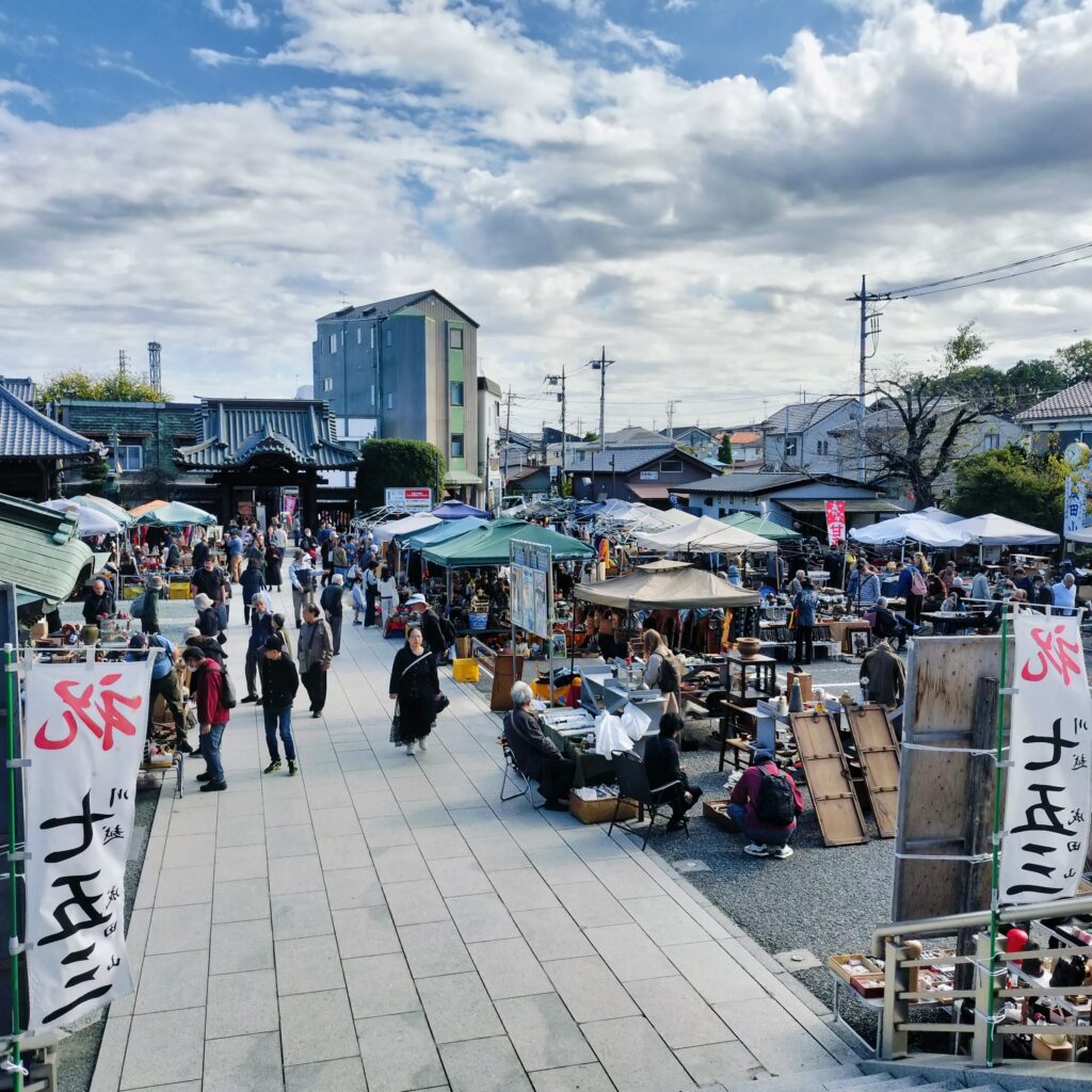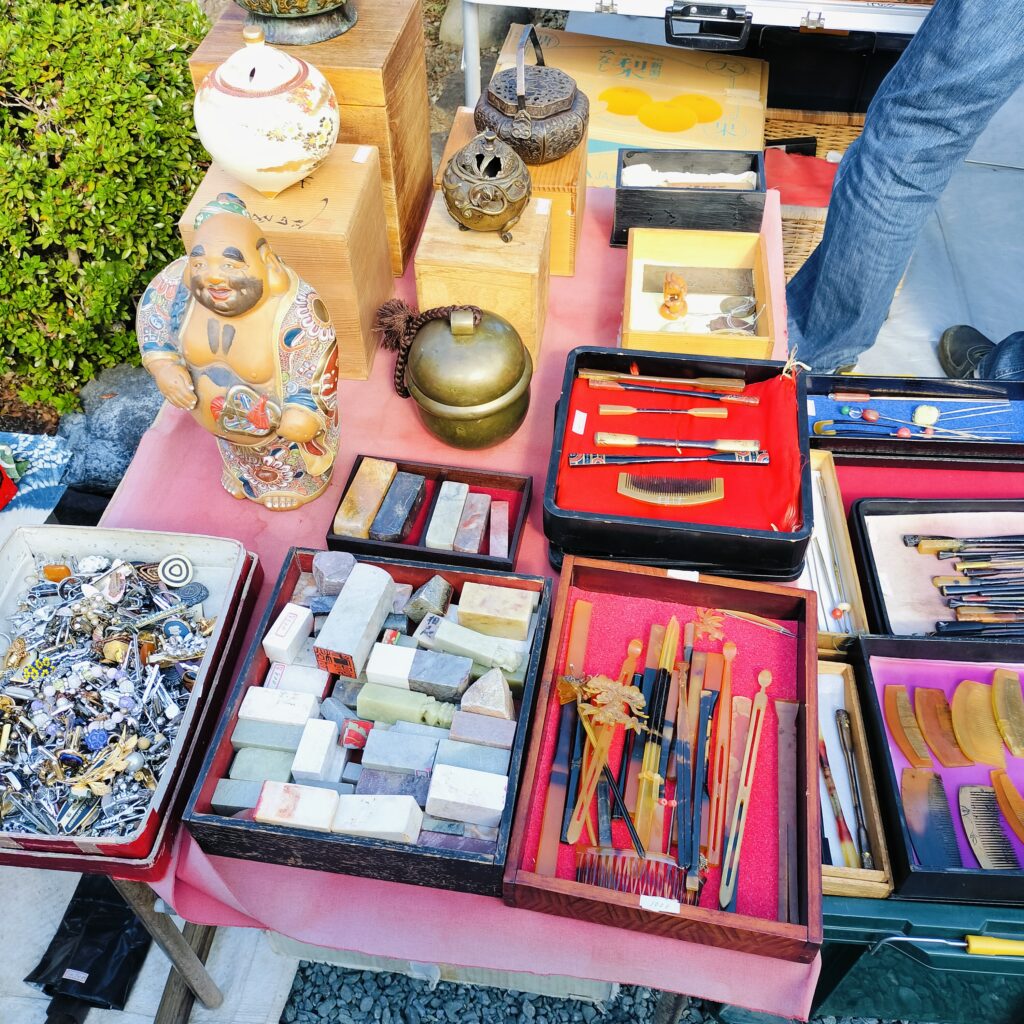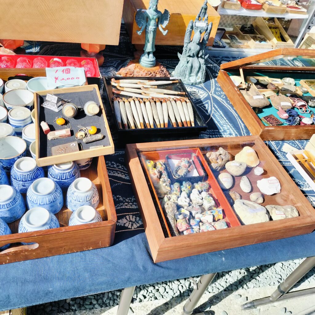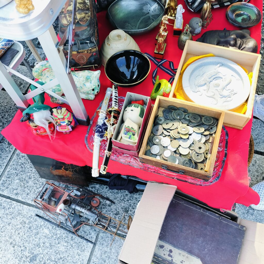 歴史のあるこの市は、古物や骨董品、古民具、着物、古銭、海外アンティーク品など、多彩な商品が約100店舗以上にわたり所狭しと並び、多くの人々が訪れます。