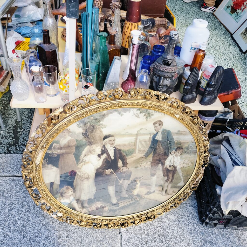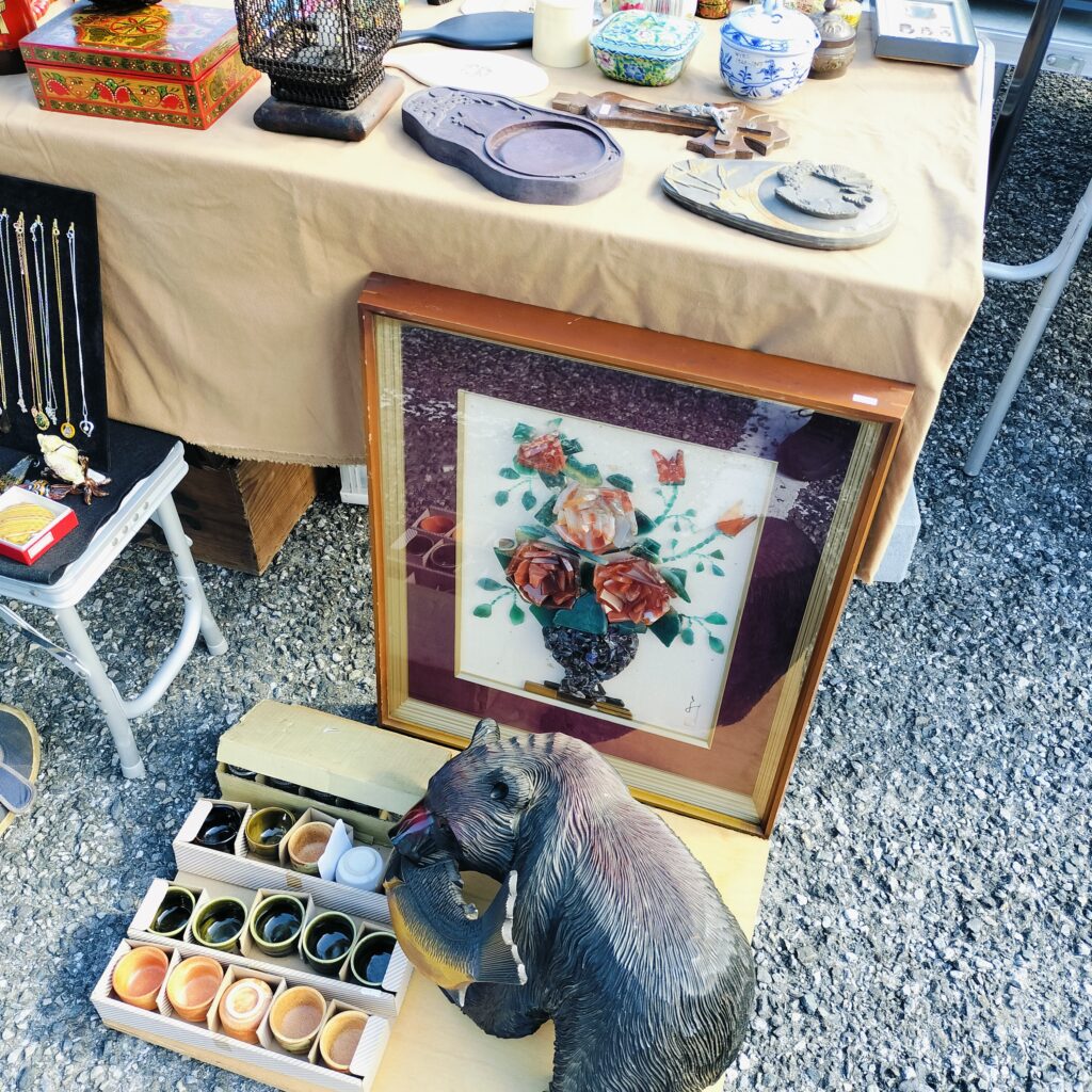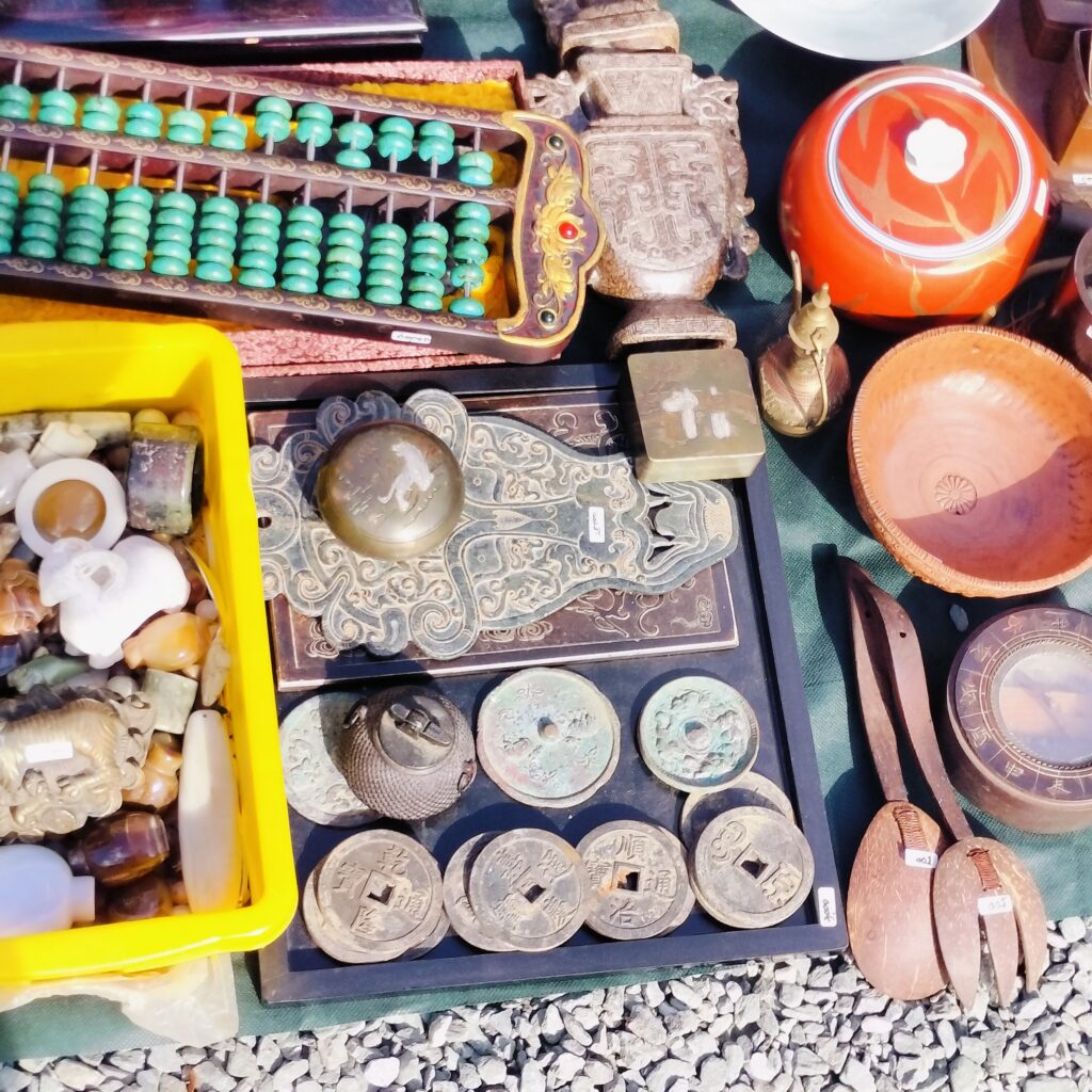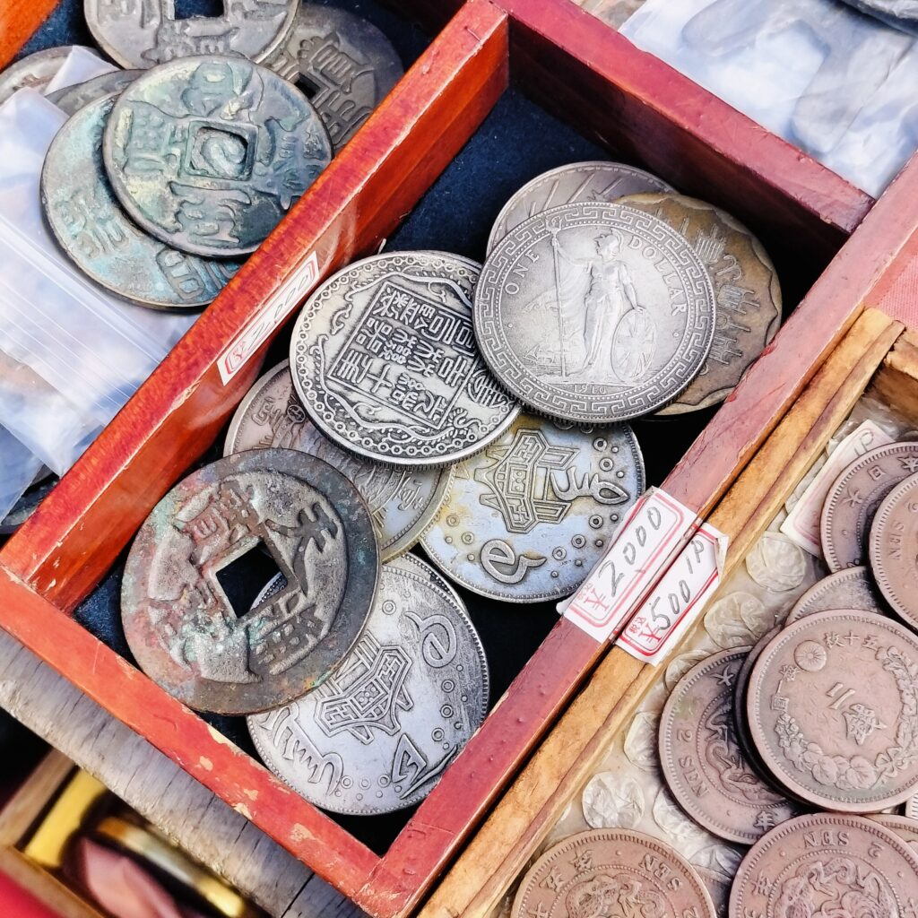 歴史のあるこの市は、古物や骨董品、古民具、着物、古銭、海外アンティーク品など、多彩な商品が約100店舗以上にわたり所狭しと並び、多くの人々が訪れます。