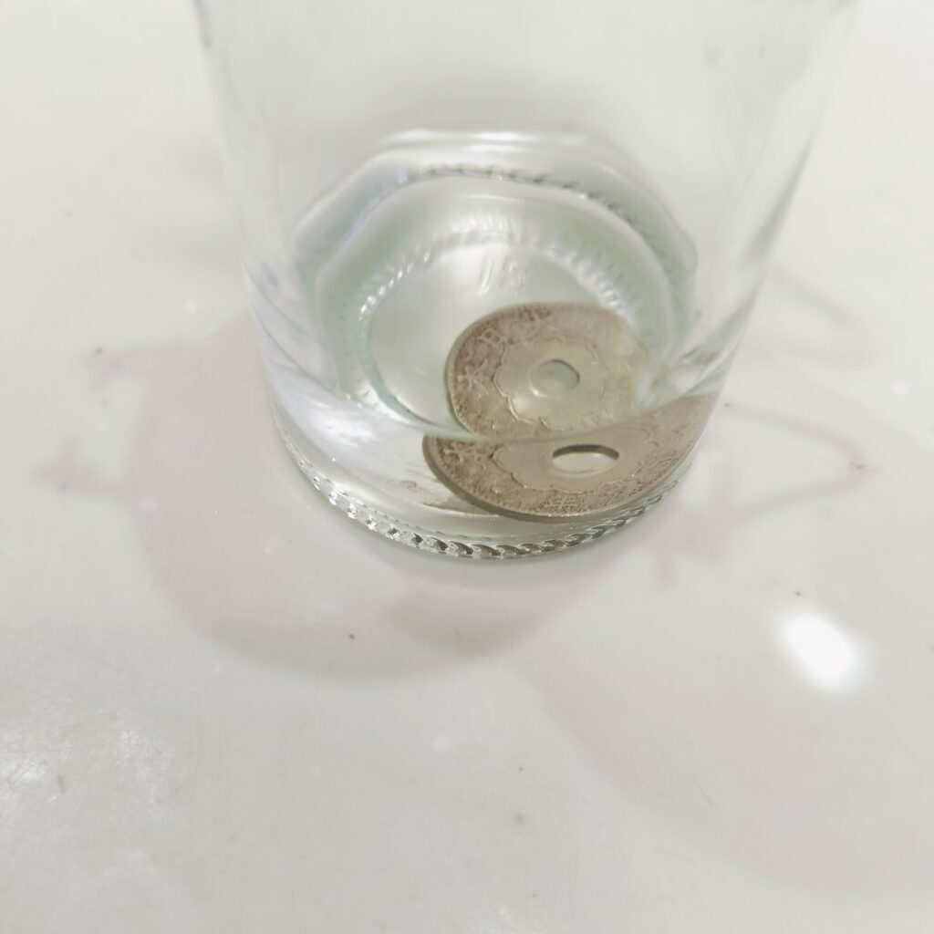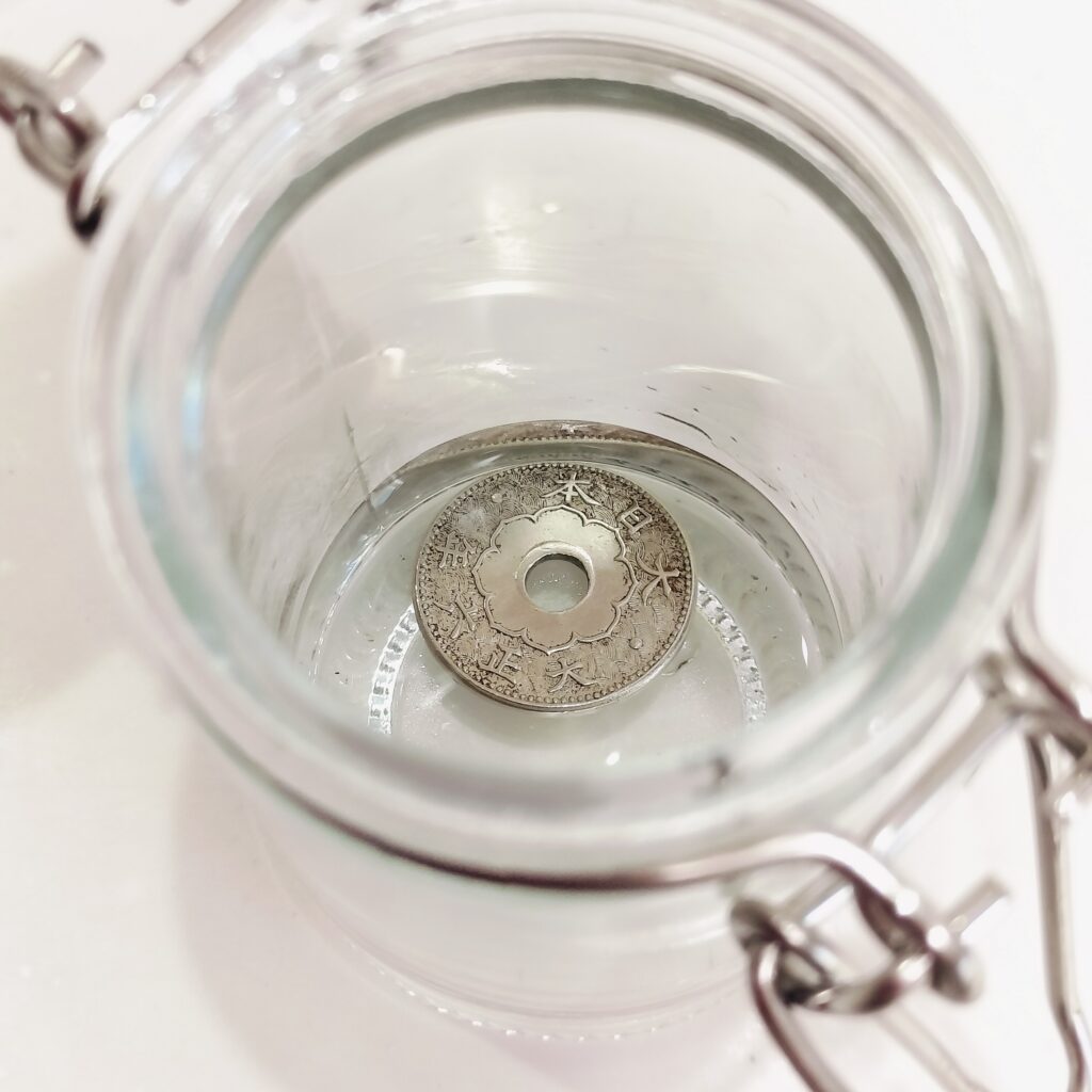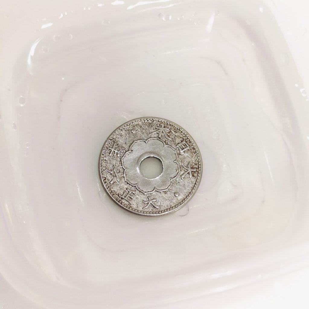 ガラスの容器にアセトンを入れ、コインを漬け置きします。
