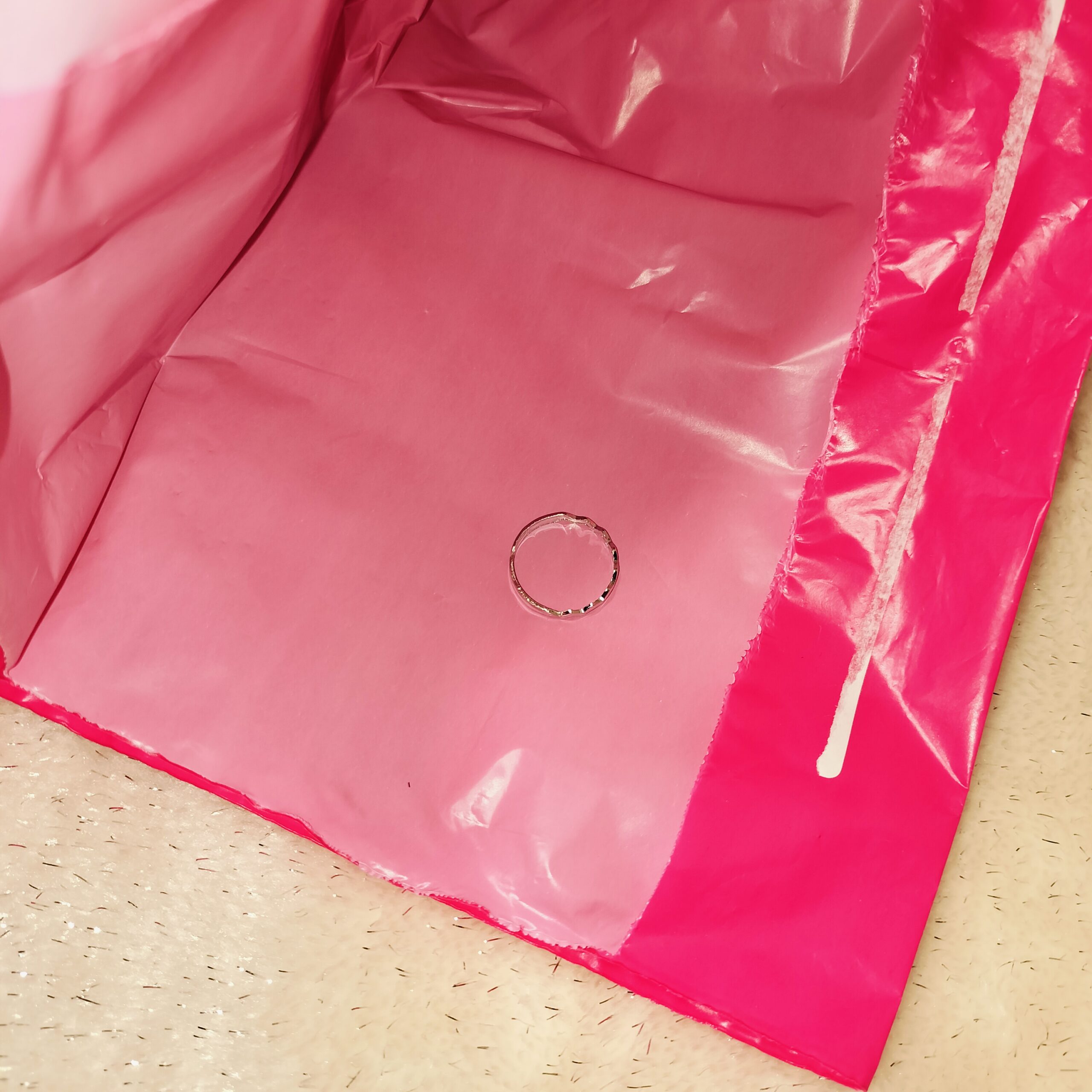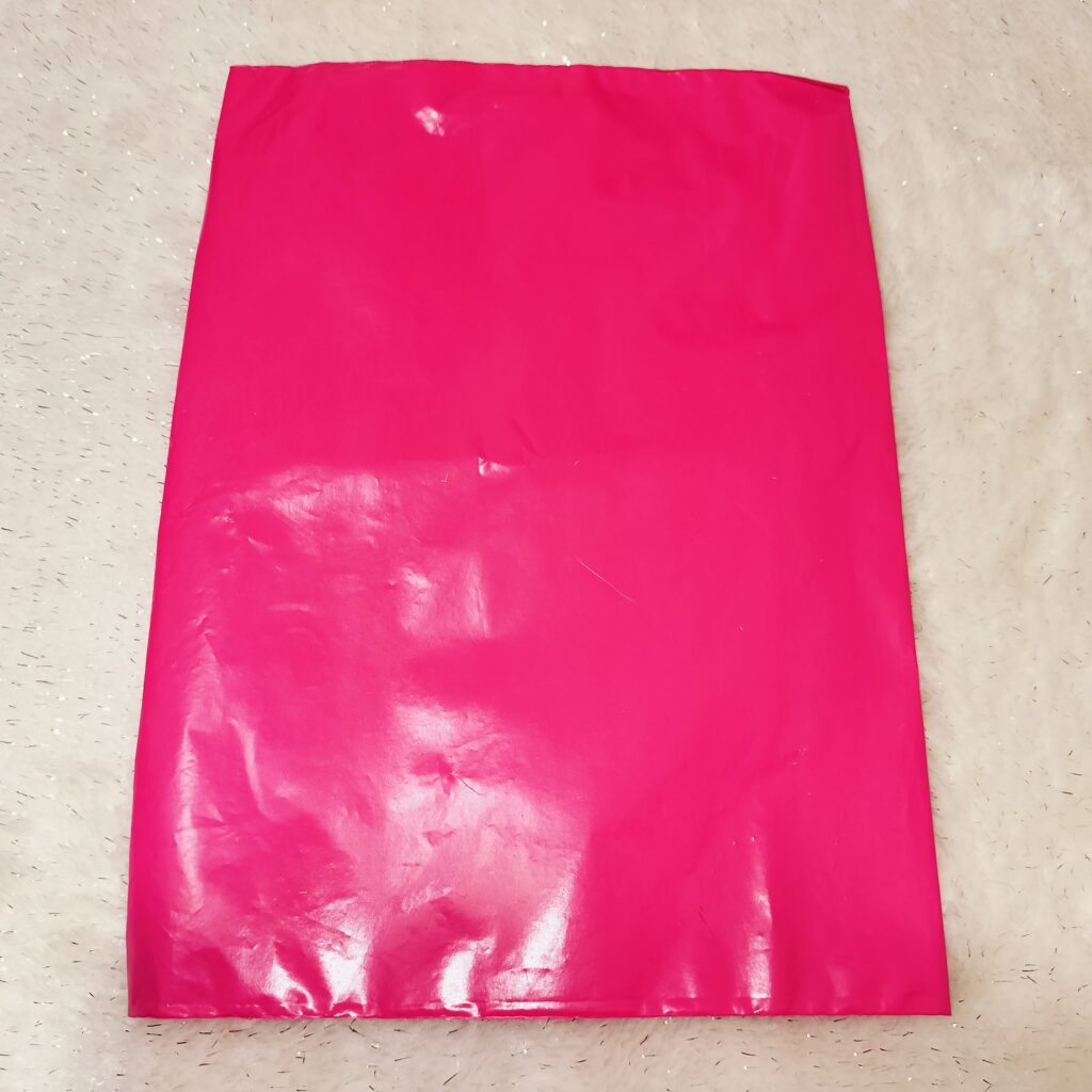 裏側には何の記載もありません、ショッキングピンクのような色のビニール製の封筒です。