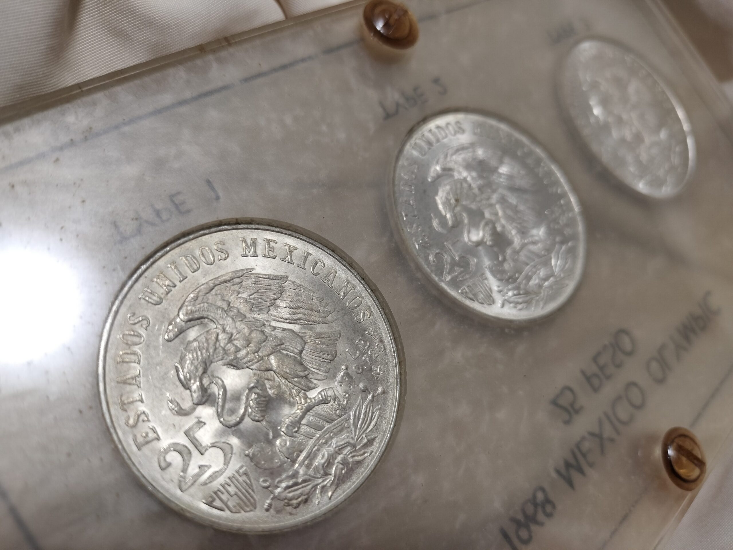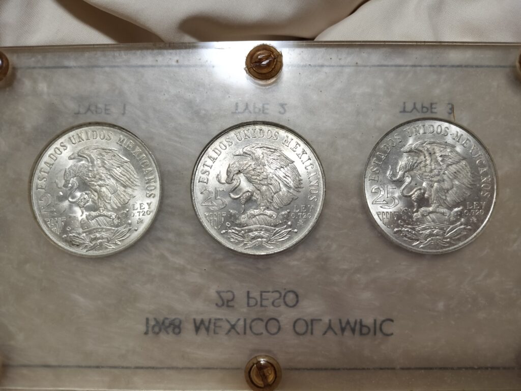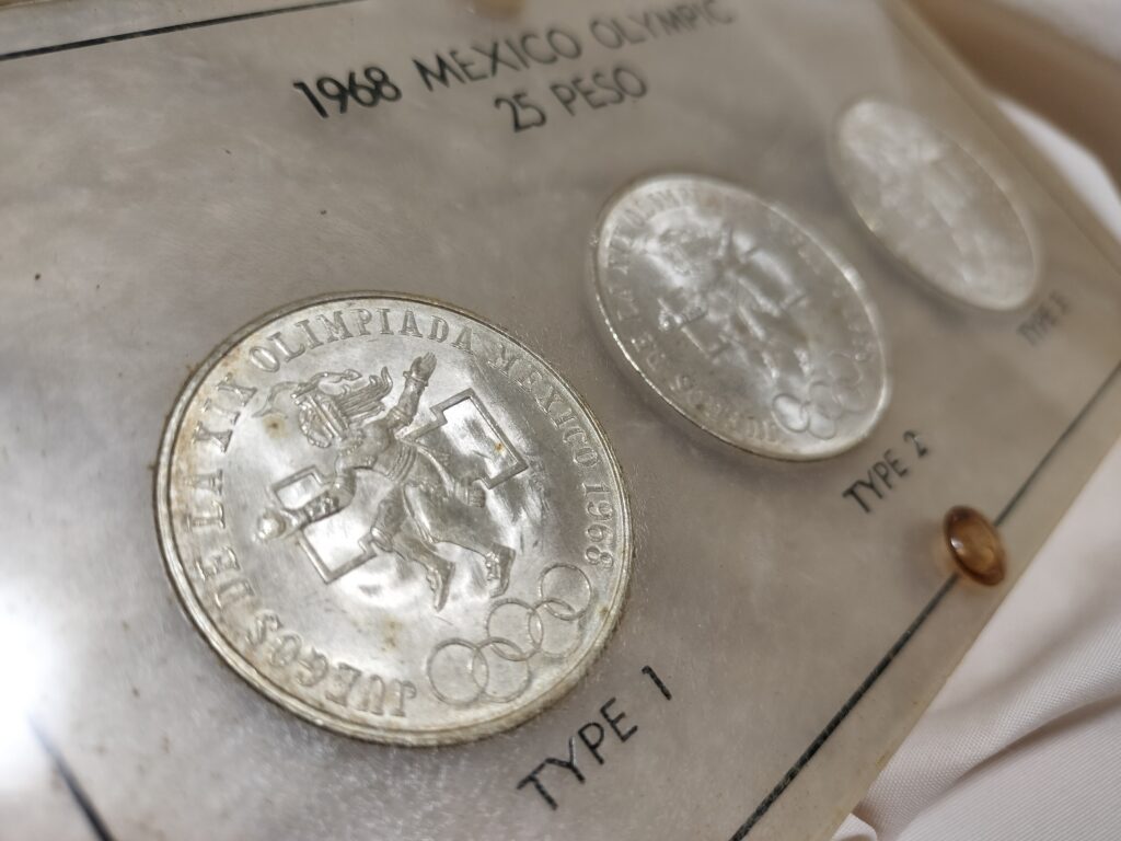 中身は1968年メキシコオリンピック記念25ペソ銀貨セットです。