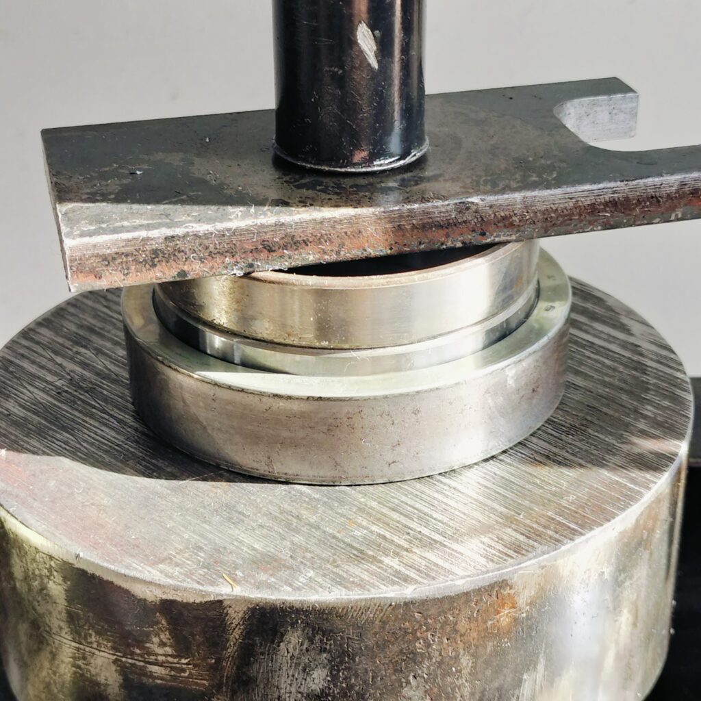 ベアリングの面で荷重をかけてしまうとベアリングの寿命低下につながるので、ジグを使ってはめ合い箇所だけで荷重をかけます。