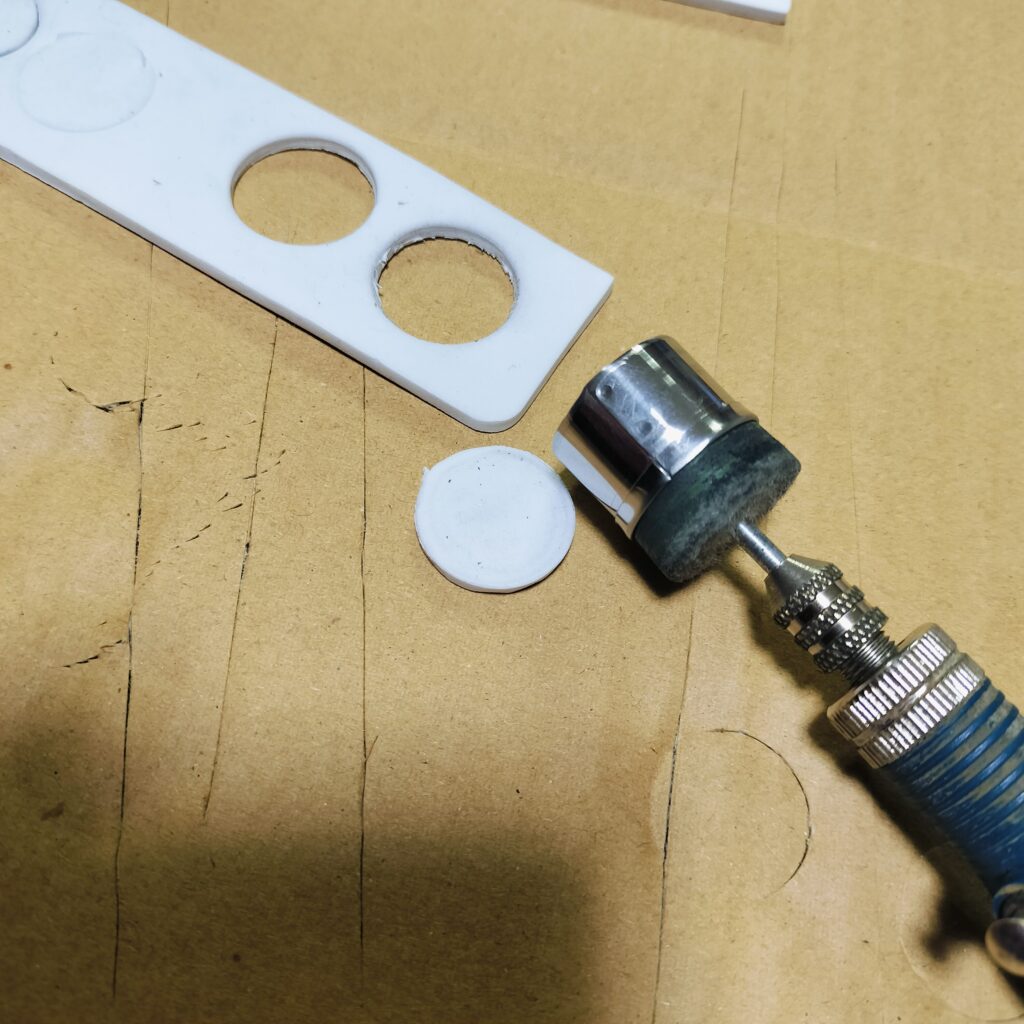 そのままだと くり抜けないので、リューターを使って先端部分を刃物のように 尖らせて、EVAシートをくり抜きます。