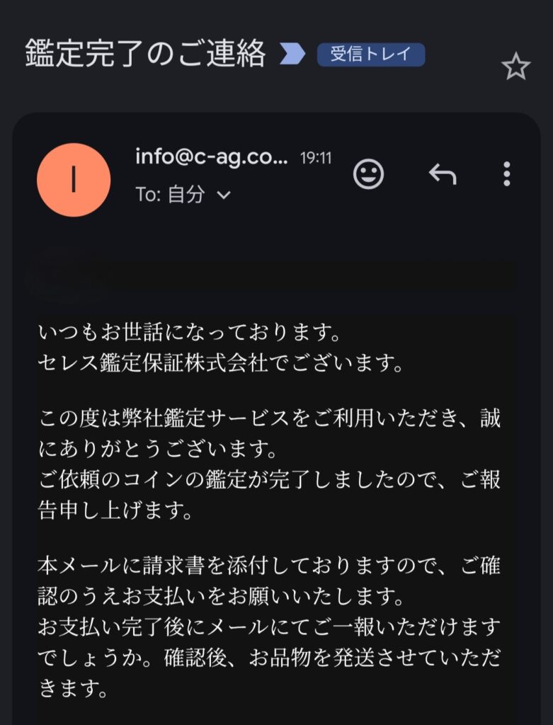先日、セレス鑑定保証株式会社に鑑定依頼を出していたコインの鑑定が完了したとのメール連絡がありました。