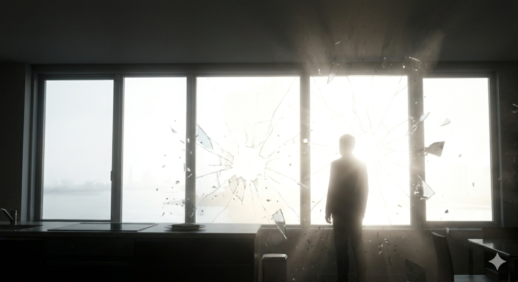 高層ビルの強化ガラスが、一枚、また一枚と、クモの巣状にひび割れていく。