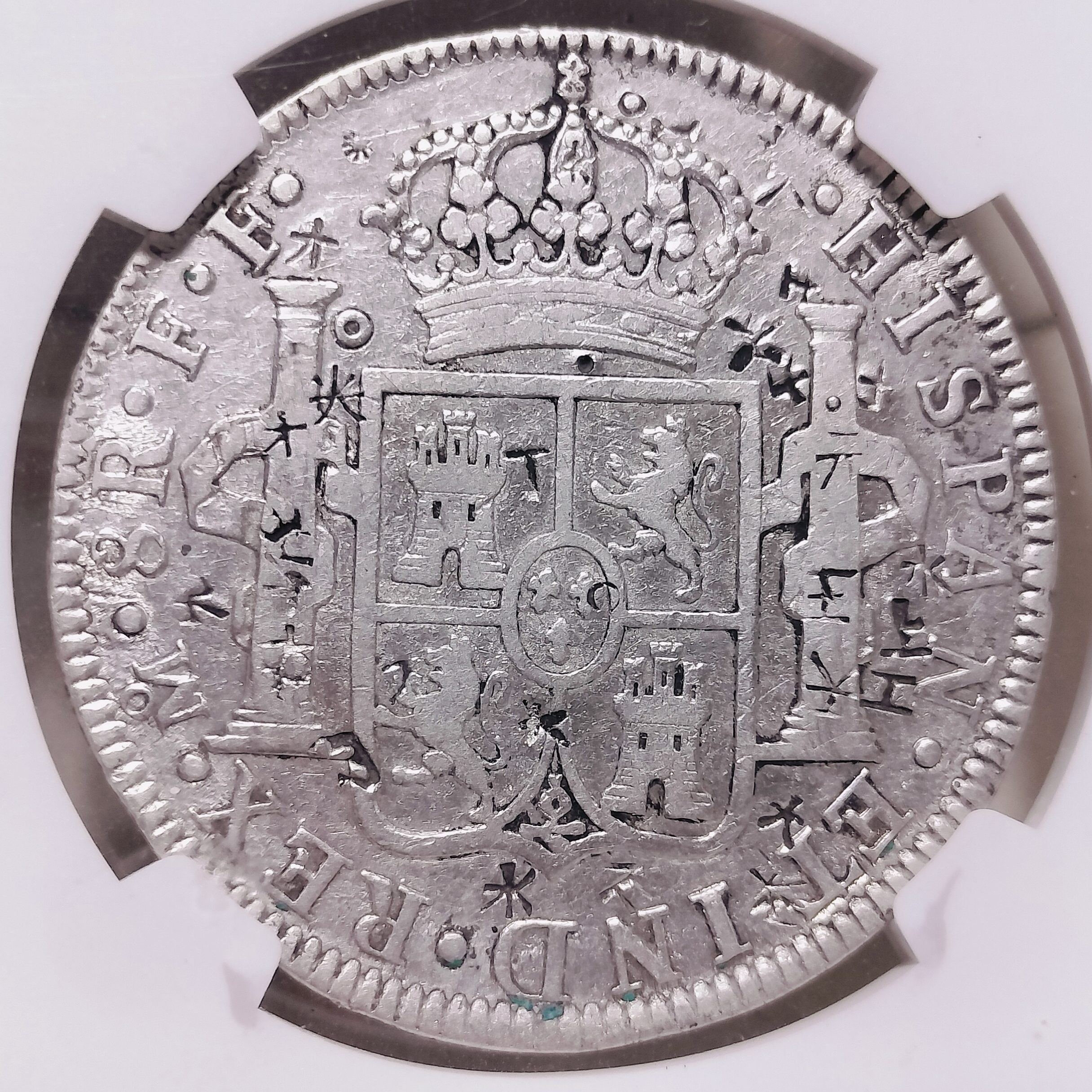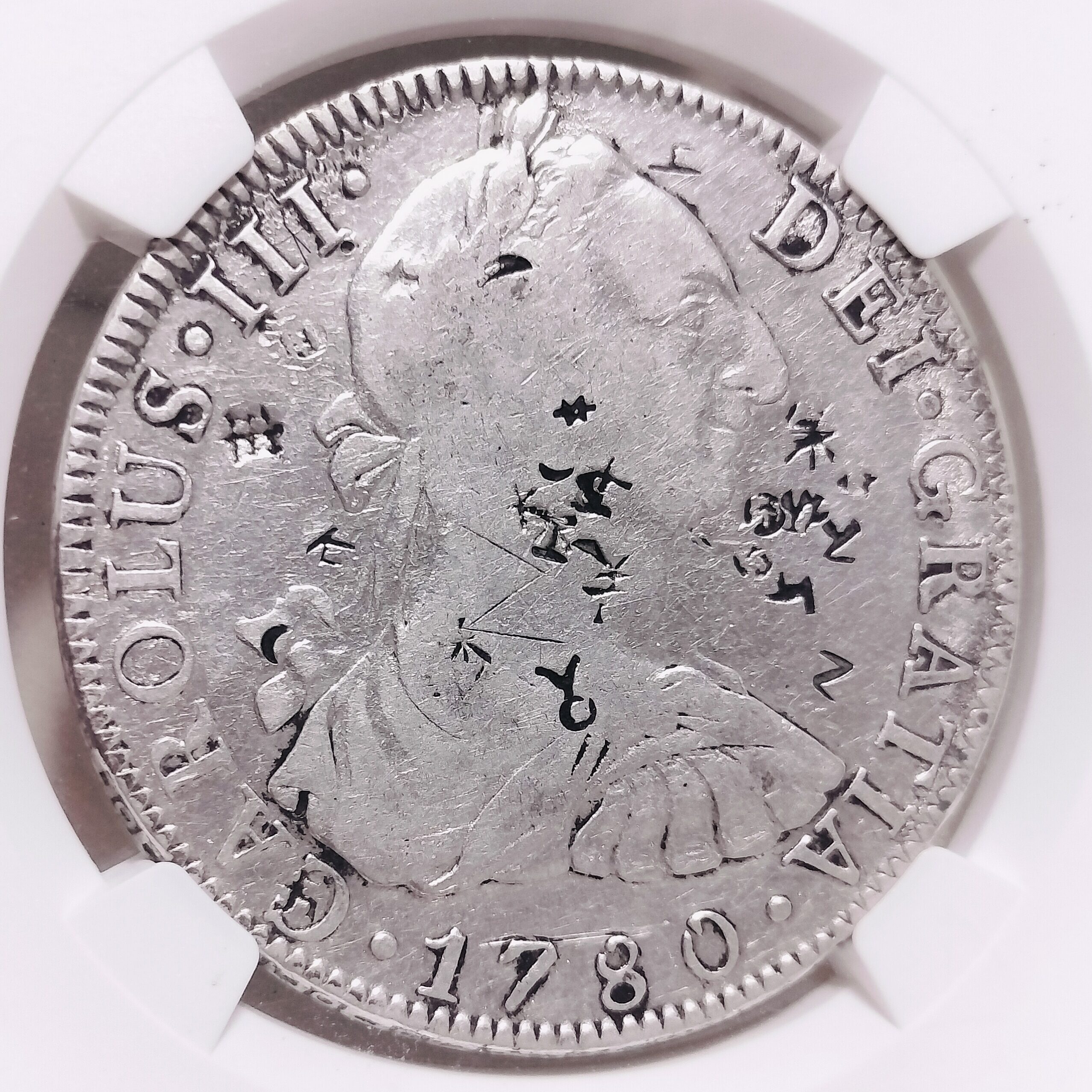 スラブのラベルに「CHOPMARKED」と記載されており、コインの両面(特にカルロス3世の顔付近)に、漢字のような小さな刻印が多数打たれているのが確認できます。
