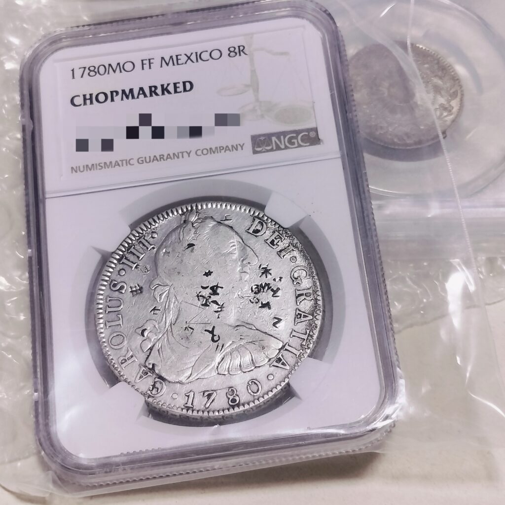 NGCでは、チョップマーク(当時の商人による刻印)がある個体については、通常の数値によるグレーディング(MS60など)を行わず、このように 「CHOPMARKED(チョップマーク付き)」 という表記でディテール鑑定としてホルダーに封入するのが一般的です。