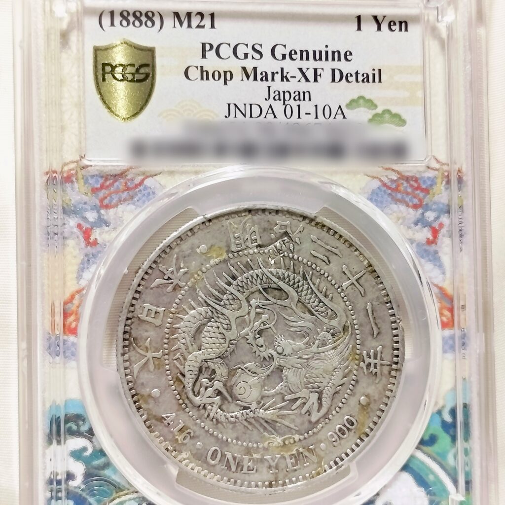 荘印があっても、それがデザインを大きく損なわず、むしろ貿易銀としての風格を漂わせている場合は、数字評価を与える柔軟性を見せます。