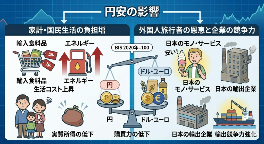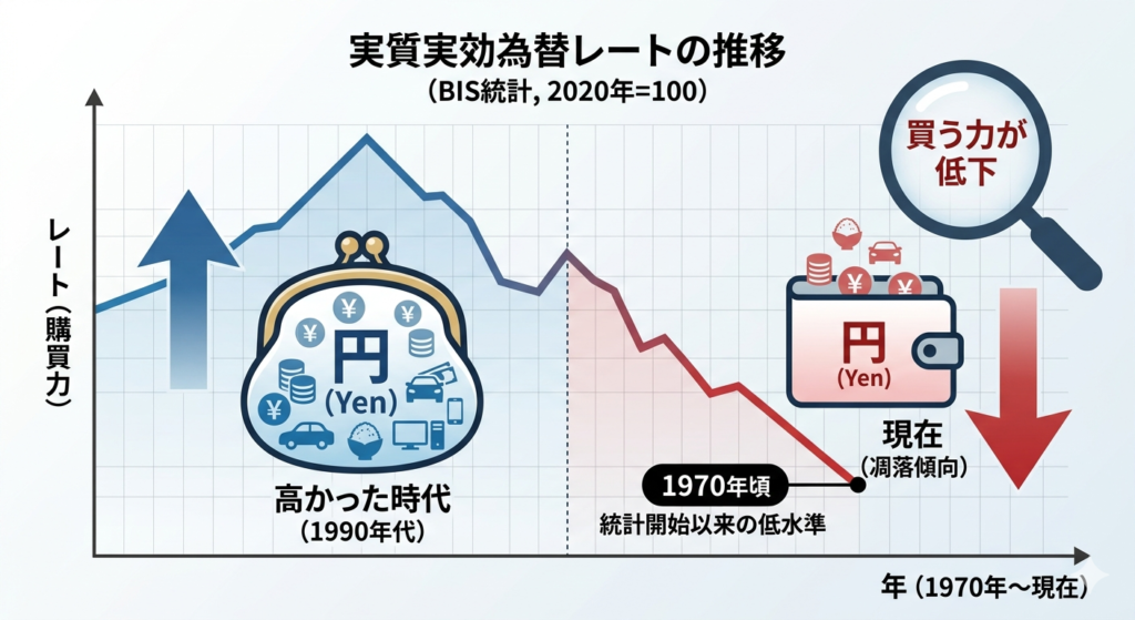 簡単に言えば、「世界中のモノやサービスを、日本円でどれだけ買えるか?」という、円の『お買い物する力(購買力)』を表しています。
