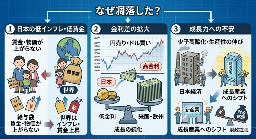 また、積極的な財政出動(お金をたくさん使う政策)による財政悪化への懸念も、投資家が日本円を売る一因となっています。