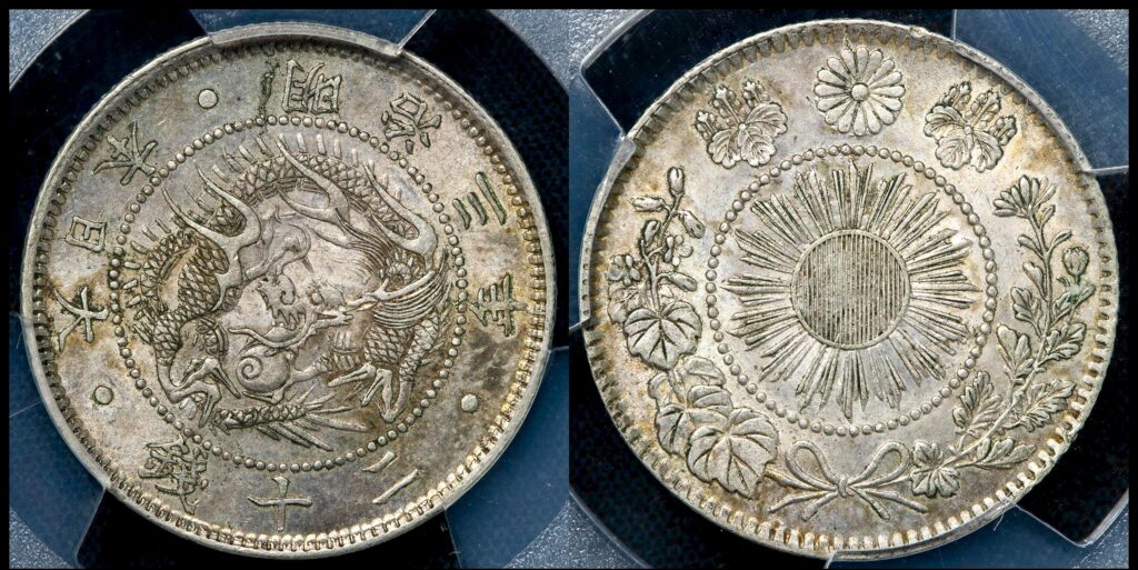 明治初期の銀貨は、表面(菊紋側)と裏面(竜図側)の刻印を組み合わせて製造されていました。