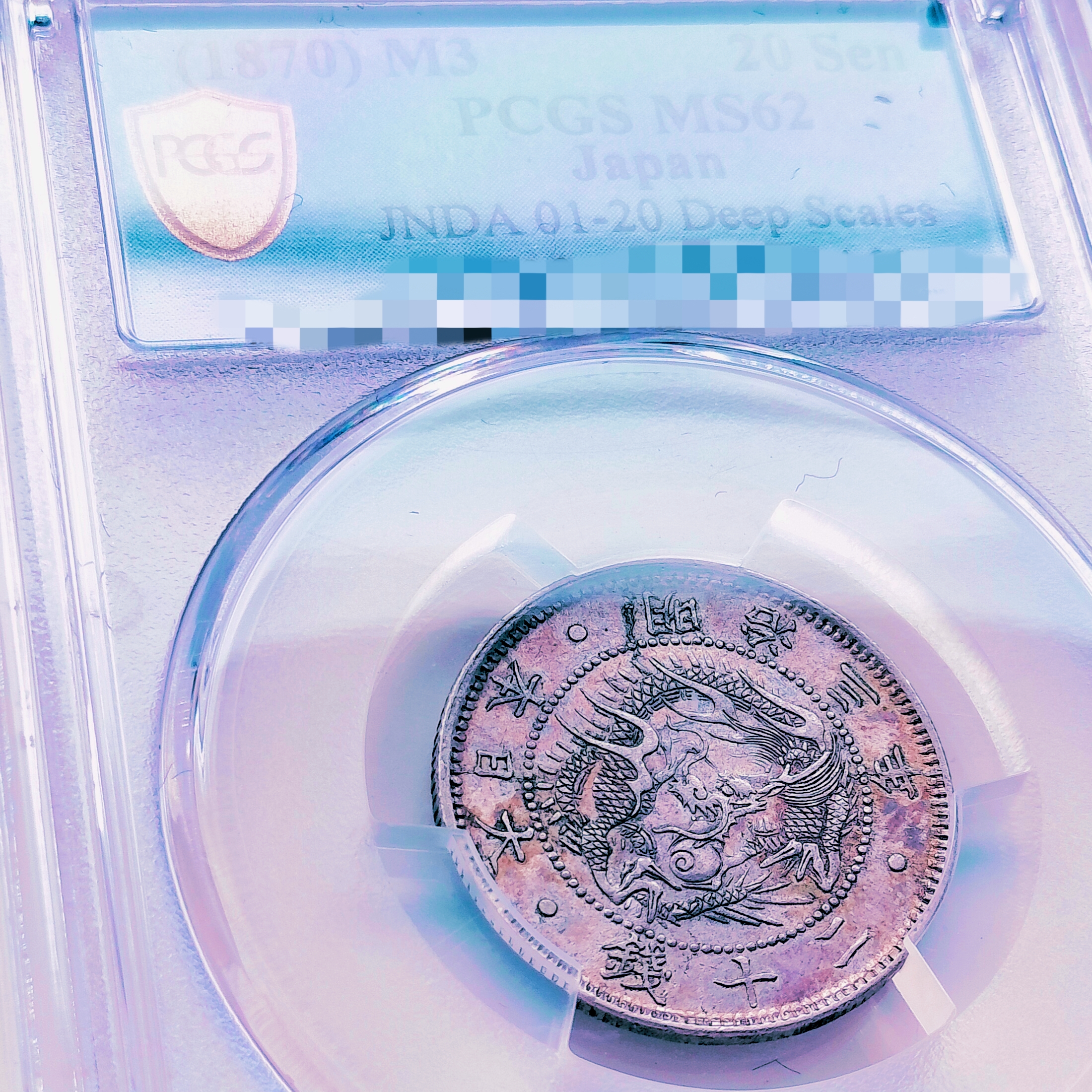 PCGS鑑定済み(MS62)で、スラブのラベルには魅力的な『Deep Scales(深鱗)』の表記が踊る、非常に力強い個体です。